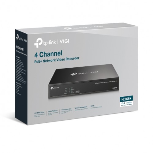 The VIGI NVR1004H‑4P is a four channel PoE+ network video recorder designed for dependable recording, live viewing and playback in smaller surveillance setups. It supports four channel live view and offers 4K HDMI video output, providing clear visuals across all connected cameras.