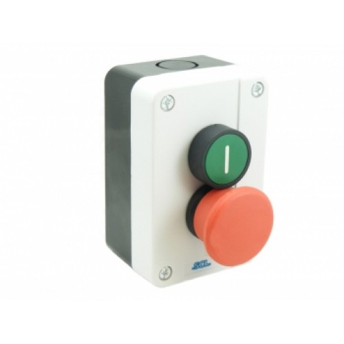 Green, Red and Emergency Twist Button - Grey Enclosure - IP65- ON OFF EM.STOP LABEL